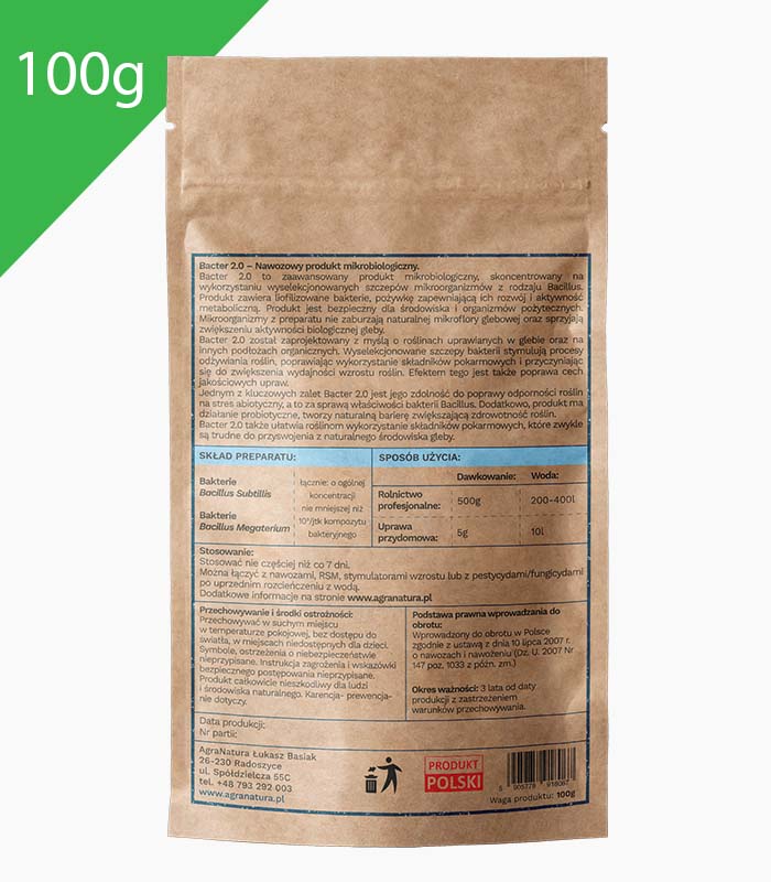 Rolnictwo profesjonalne: 500g Bacter 2.0 rozpuścić w 200-400l wody i opryskać lub podlać rośliny.